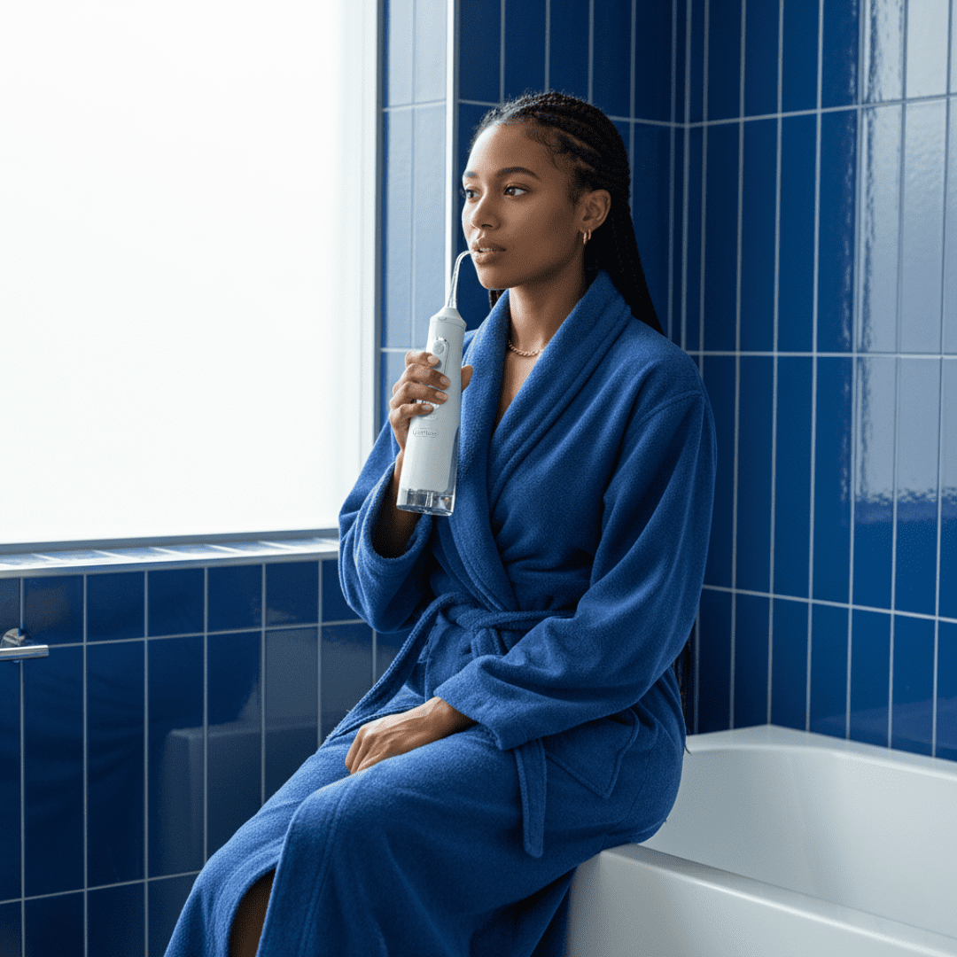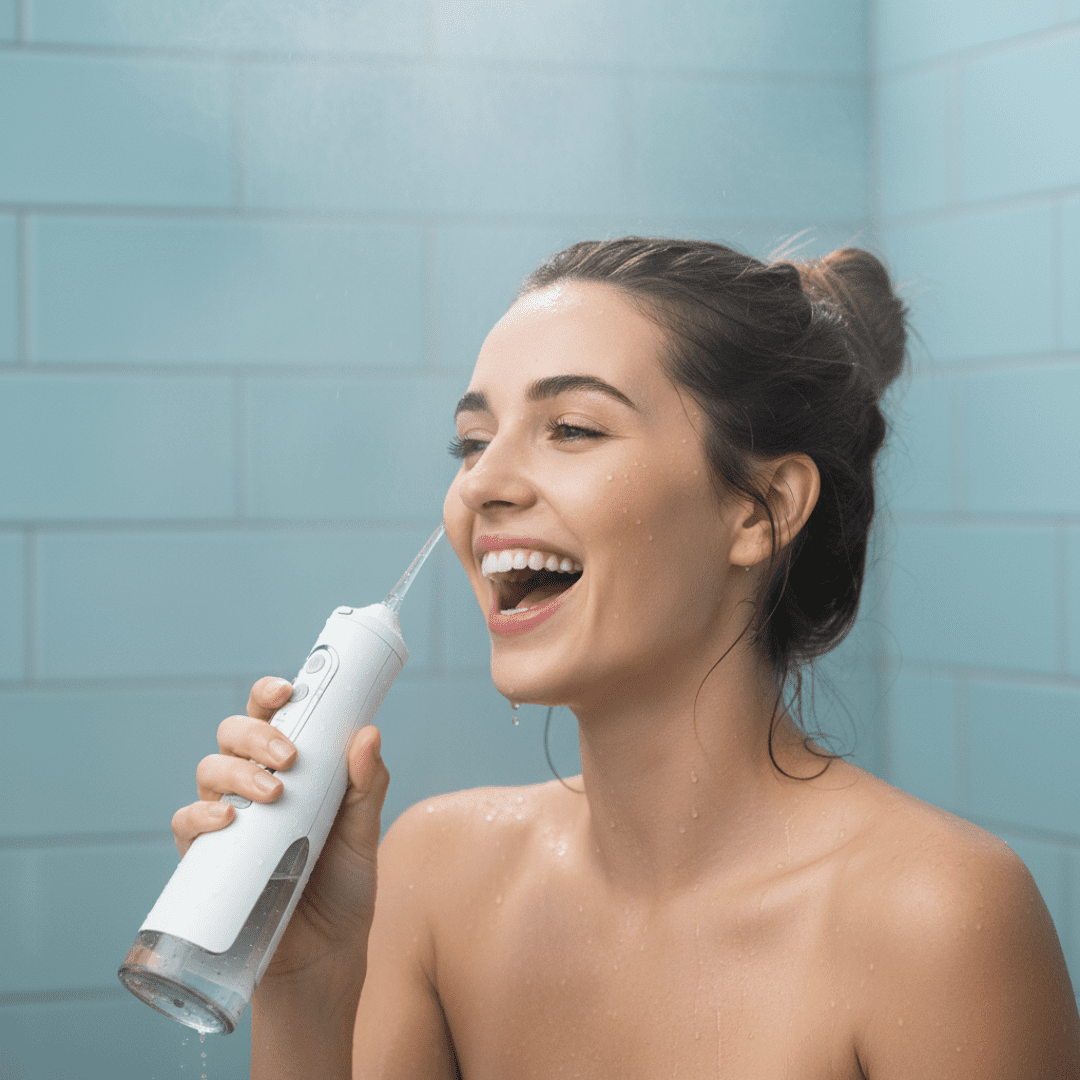 Aponte o jato entre os dentes e ao longo da gengiva. Sem esforço, sem dor, e com aquela sensação de boca limpa de verdade.